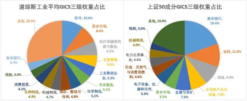 一、成分概况:上证50行业集中度更高,道琼斯行业分布更合理