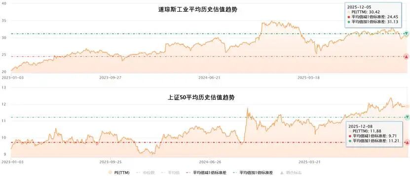 这一点也能从两种指数的平均估值看出端倪,道琼斯工业指数的PE估值基本是上证50的3倍左右。