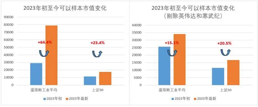 但实际上,自AI纪元爆发以来,道琼斯可比样本中,仅英伟达一家公司,市值从3600亿暴涨至4.5万亿左右,贡献了道琼斯绝大多数市值增量,因此横向对比相对失真。因此我们同时剔除道琼斯样本中的英伟达和上证50中的寒武纪。