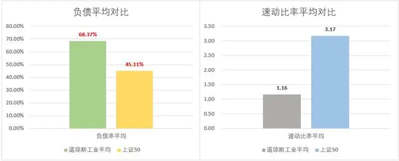 同时在偿债保障上,上证50的策略明显更加保守,整体的速动比率达到了3.17倍,而道琼斯工业平均样本企业的速动比率均值仅为1.16倍。