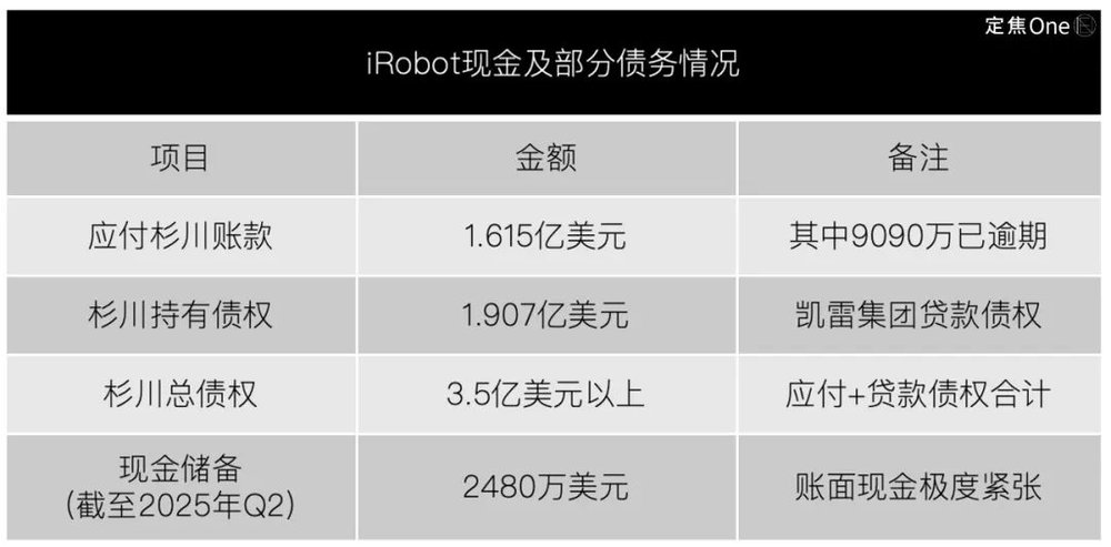 iRobot欠杉川的债务合计超过3.5亿美元(应付账款1.615亿+贷款1.907亿),占其总负债的70%以上。而iRobot账面现金仅剩2480万美元,已资不抵债。