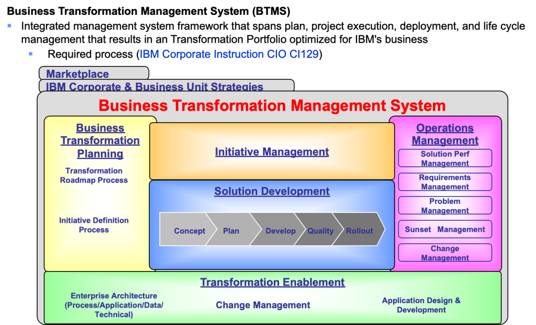 下图是IBM原版的BTMS体系,这套体系在IBM是2005年前后逐渐形成并正规化的,华为那个框架基本上是原样学习IBM的,连BTMS这个词也直接照搬了: