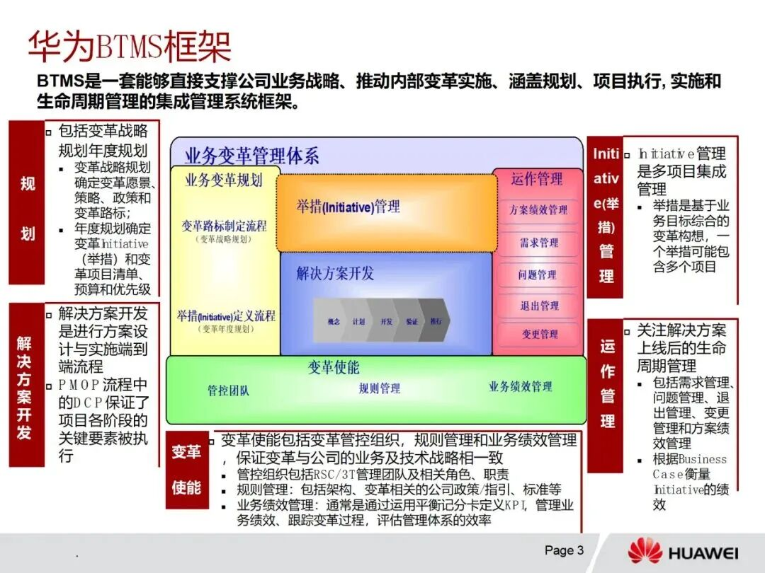 华为“业务变革管理体系(Business Transformation Management System,或者也称业务转型管理体系,简称BTMS)”是一套集战略规划、项目执行、实施与生命周期管理于一体的集成管理系统。