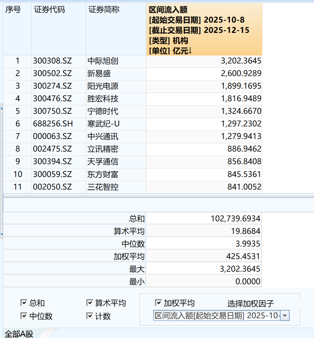 从10月8日至12月15日,寒武纪的机构资金区间流入额约1297亿元,中芯国际的机构资金区间流入额约552亿元,海光信息的机构资金区间流入额约430亿元,新上市的摩尔线程,机构资金区间流入额也有127亿元。