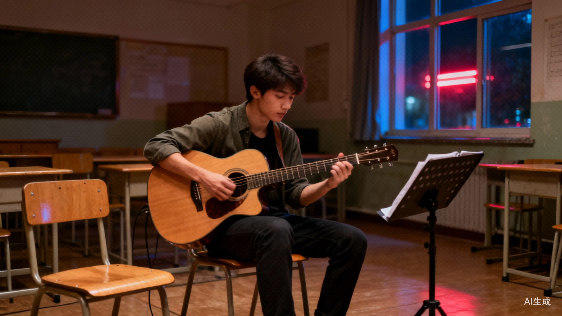 晚上没课的时候,他会坐在房间里练琴。音量不敢开大。他弹得很慢,有时只是反复一个和弦。窗外的霓虹灯闪了一下,又暗下去。