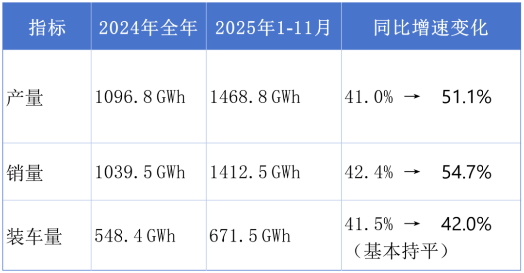 2025年1-11月,我国动力和其他电池累计产量为1468.8GWh,累计同比增长51.1%;销量为1412.5GWh,累计同比增长54.7%;累计装车量671.5GWh,累计同比增长42.0%。
