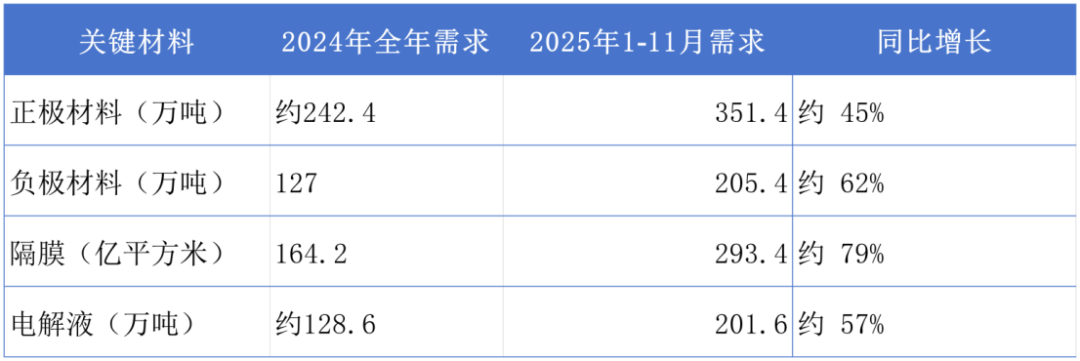2025年1-11月,我国动力和其他电池用三元材料61.9万吨,磷酸铁锂材料290.2万吨;负极材料205.4万吨;隔膜293.4亿平方米;三元电池用电解液27.5万吨,磷酸铁锂电池用电解液174.1万吨。与此相对,2024年,我国动力和其他电池用三元材料49.0万吨,磷酸铁锂材料193.4万吨;负极材料127.0万吨;隔膜164.2亿平方米;三元电池用电解液22.5万吨,磷酸铁锂电池用电解液106.1万吨。