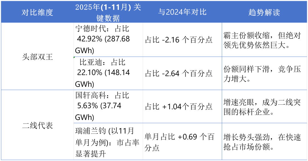 头部企业中,宁德时代1-11月装车287.68GWh,占比42.92%,相比去年全年下降2.16个百分点),比亚迪装车148.14GWh(占比22.1%,相比去年全年数据下降2.89个百分点),“双王”合计占比65.02%,较2024年减少近5个百分点、较2023年超70%的高位大幅收缩。