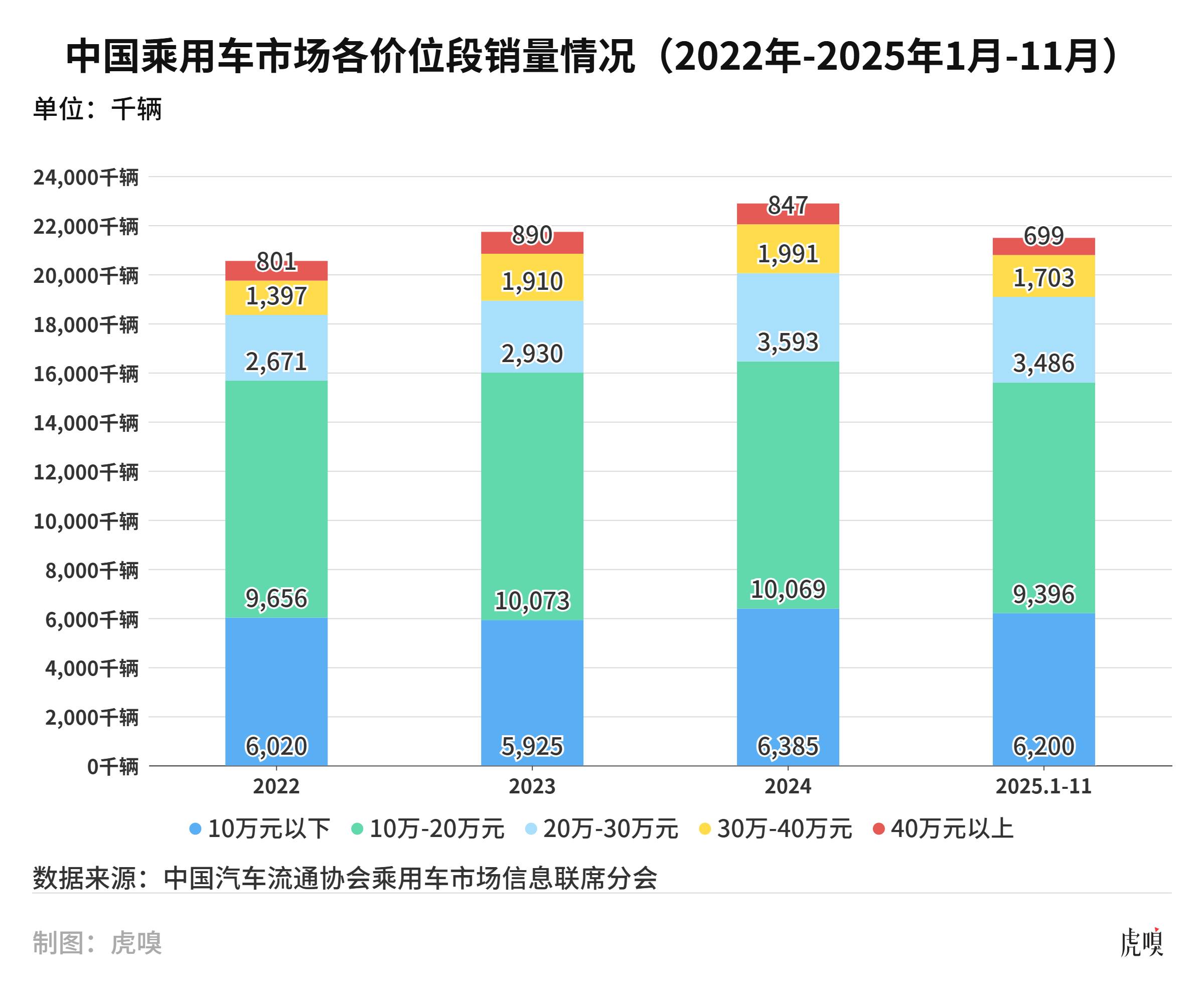 根据中国汽车流通协会乘用车市场信息联席分会(下称乘联分会)的数据,2025年前11个月,豪华品牌销量同比下降10.6%,其中40万以上车型下降8.2%,30万—40万区间下降4.0%。最令人心惊的是,曾经被视为“利润奶牛”的30万—40万级轿车市场成为下滑最大的细分品类,跌幅高达14.4%。
