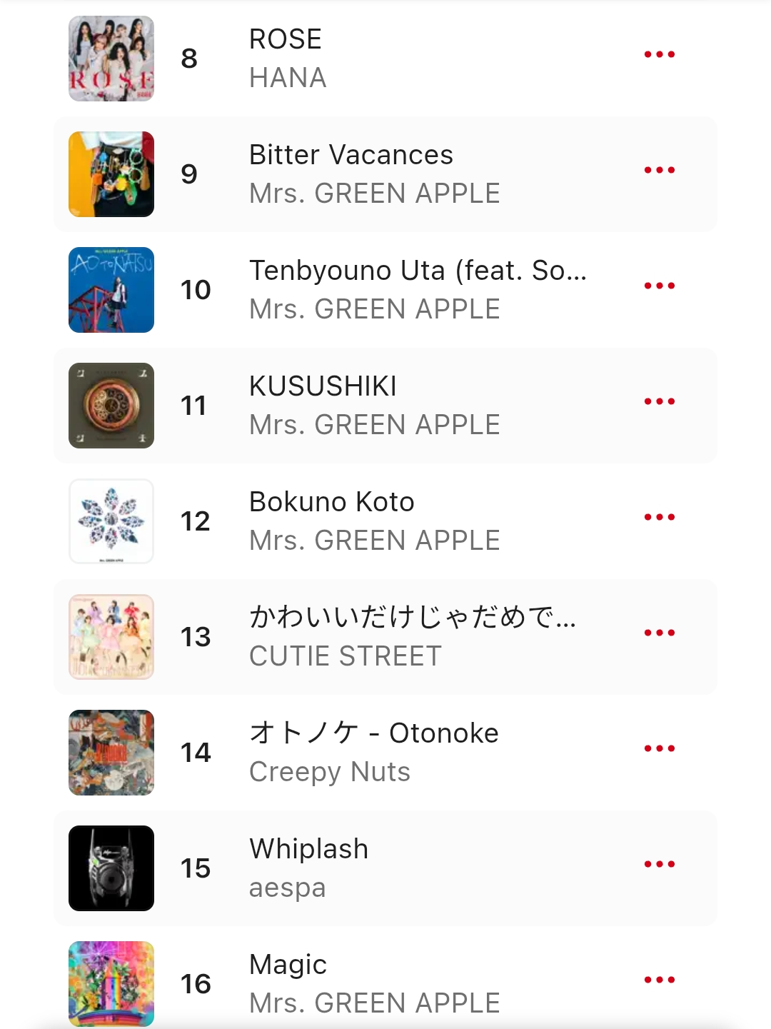 以日本Apple Music年度总结为例,虽然整体上也不乏怀旧经典的余韵——Mrs.GREEN APPLE多首古早经典作品比重占比较大,然而,TOP 100中发行于2024年以后的新歌占比仍然处于超过50%以上,仅在TOP20中,发行于2024年-2025年的作品便有10首。