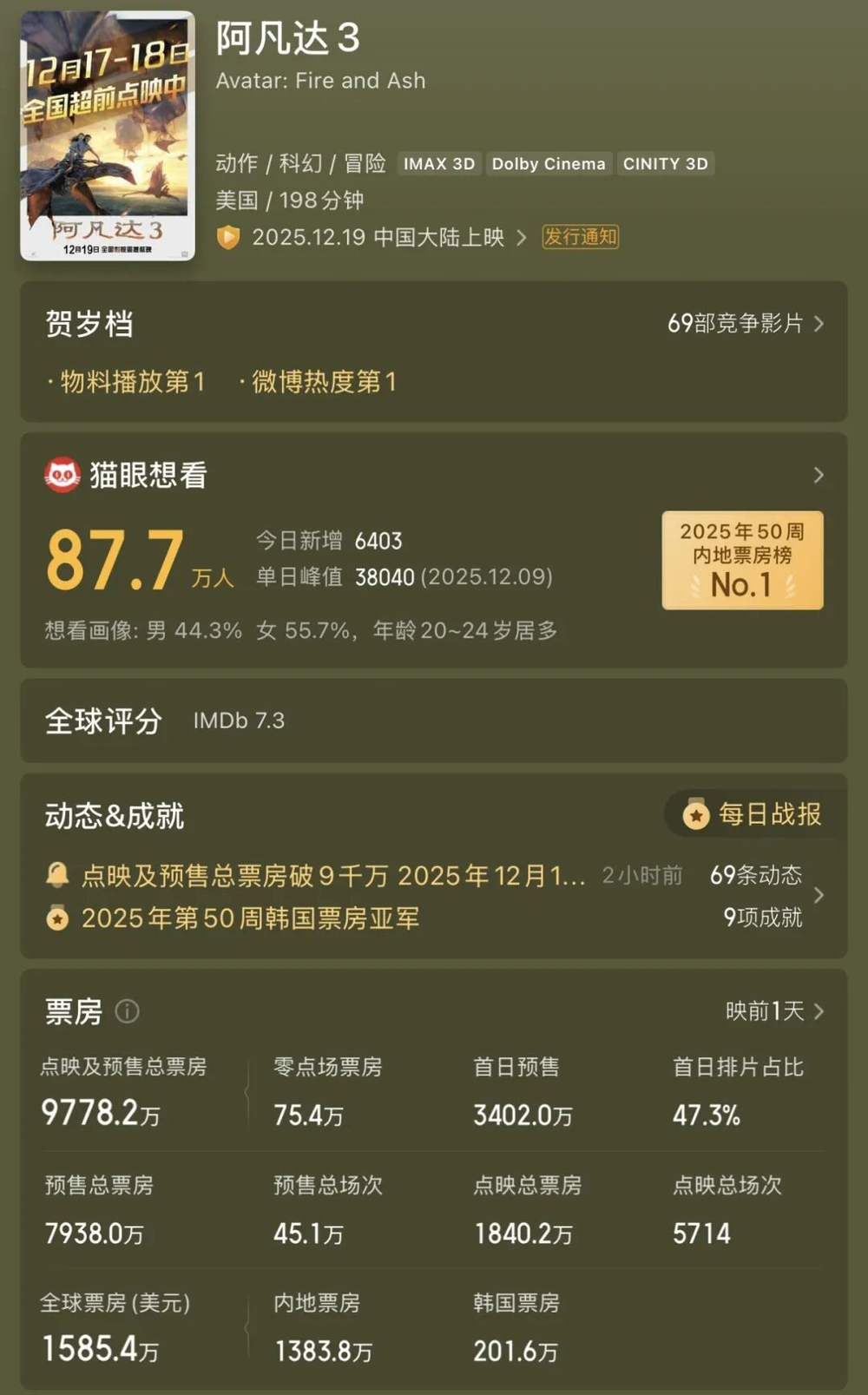 电影《阿凡达:火与烬》于12月17日开始点映,此时距离正式上映仅有2天时间。根据最新数据,直到12月16日晚间预售刚突破5000万,目前全国点映及预售票房约9778万。
