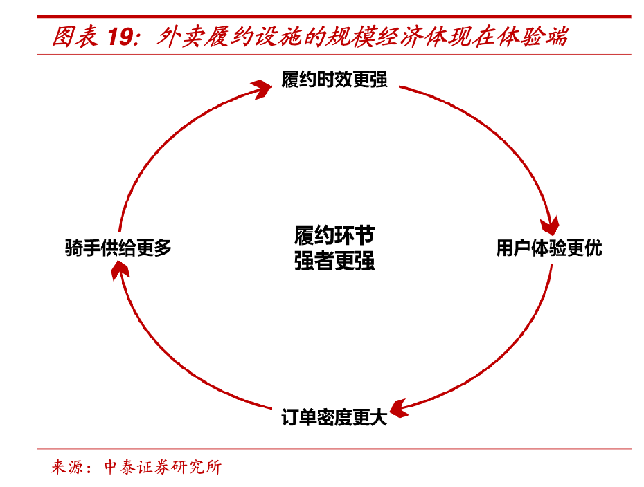 中泰证券2022年在一份研报指出,外卖平台在履约环节具有独占性和规模经济,一旦领先,就会成为龙头公司的重要竞争力,帮助其抵御竞争。这一结构决定了外卖行业极易形成“强者更强”的竞争格局。