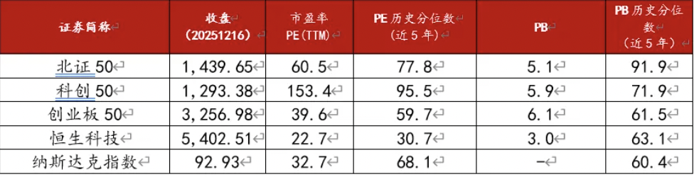 将创50与北证50、科创50等科创类指数进行比较可见,当前科创50 PE 153.4倍,是各类指数中PE最贵的,北证50其次,创50居中,亦高于纳指及恒生科技。