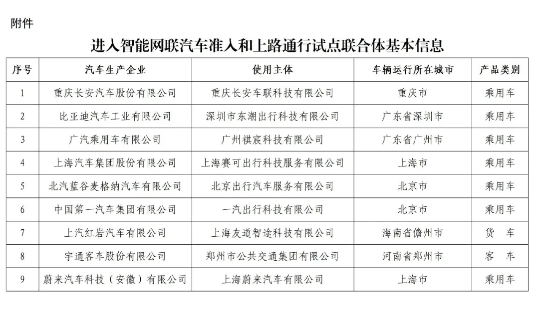 后者的全称为《智能网联汽车准入和上路通行试点联合体试点名单》,该名单是2024年由工信部主导,四部门联合审批确认。这个名单上其实只有九家联合体。