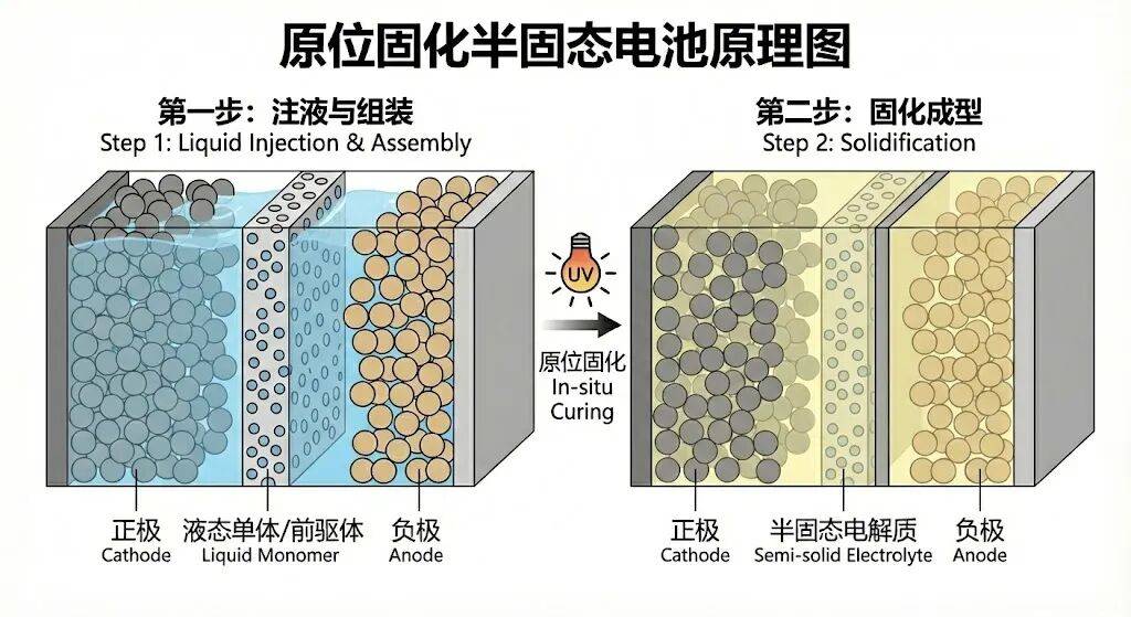 卫蓝的聪明之处在于,它先在石子(固体电极)缝隙里灌入“浆糊”(液体单体),然后通过原位固化技术让它变粘、变干,最终形成一种半固态的混合体。