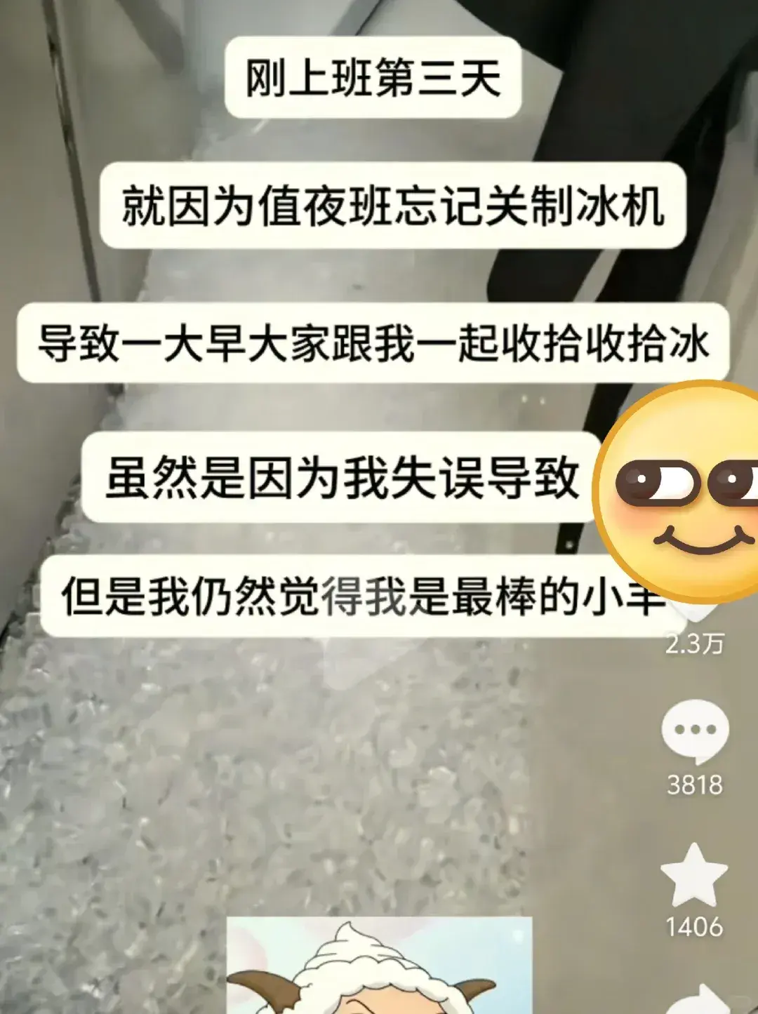 尤其是刚上班第三天忘记关制冰机导致全体同事帮着他收拾烂摊子的某只小羊,蠢到把所有人都拖下水了,还没忘了让大伙夸夸自己真棒。就像一个五岁小孩摔倒了,等着他的爷爷奶奶飞奔过来踹马路牙子一脚。