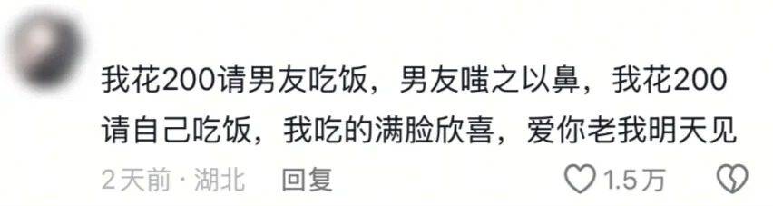 老己文学上来反手就是一招:我花200请男友吃饭他不屑一顾,我花200请老己吃饭大快朵颐。
