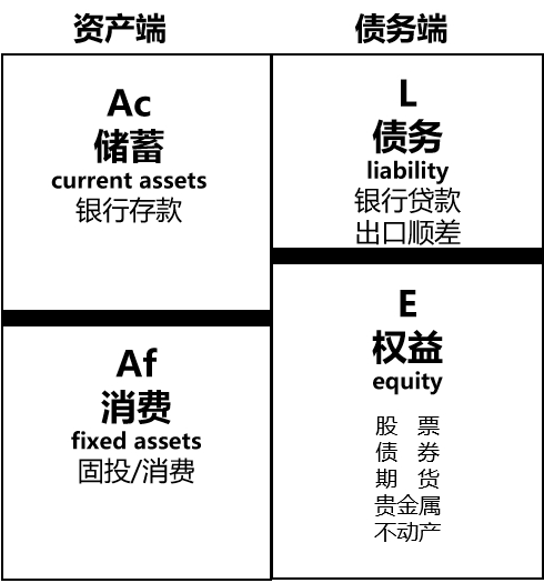 我们可以用一个资产负债表表示权益和货币创造的关系,表的右侧是债务端,由债务和权益两部分组成,表示钱从哪里来;左侧是资产端,由流动资产和固定资产组成,表示钱到哪里去。资产负债两端必须相等。从资产负债表中就可以发现,消费就是固定资产,内需就是债务端(货币总量)减去储蓄的剩余。如果说资产端创造了供给,债务端就创造了需求。