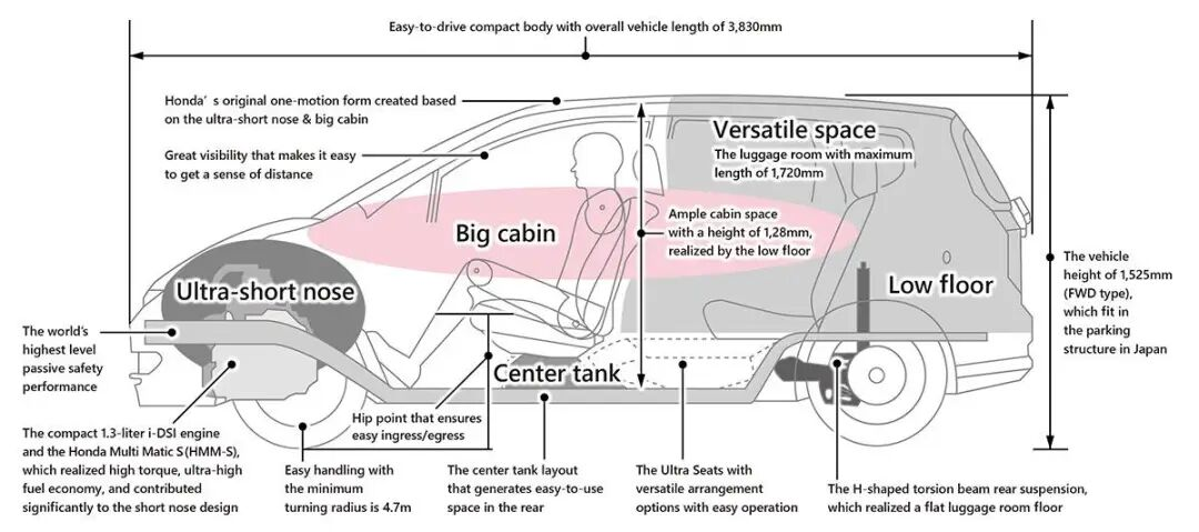 这就不得不提那个被无数工程师奉为圭臬的MM理念,也就是乘员空间最大化,机械空间最小化。这句口号听起来像是放在PPT首页的虚词,但在飞度身上,它是实打实的工程布局。为了在仅仅4米长的车身里通过物理手段压榨出越级的车内空间,本田的工程师做出了一个在当时看来相当冒险的决定,那就是中置油箱布局。