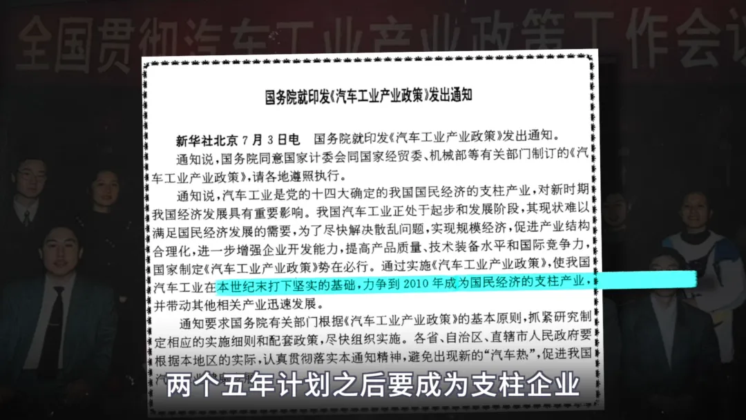 1994年7月,中国第一个汽车产业政策正式发布。里面提到:本世纪打基础,两个五年计划后成为支柱产业,带动其他产业迅速发展。