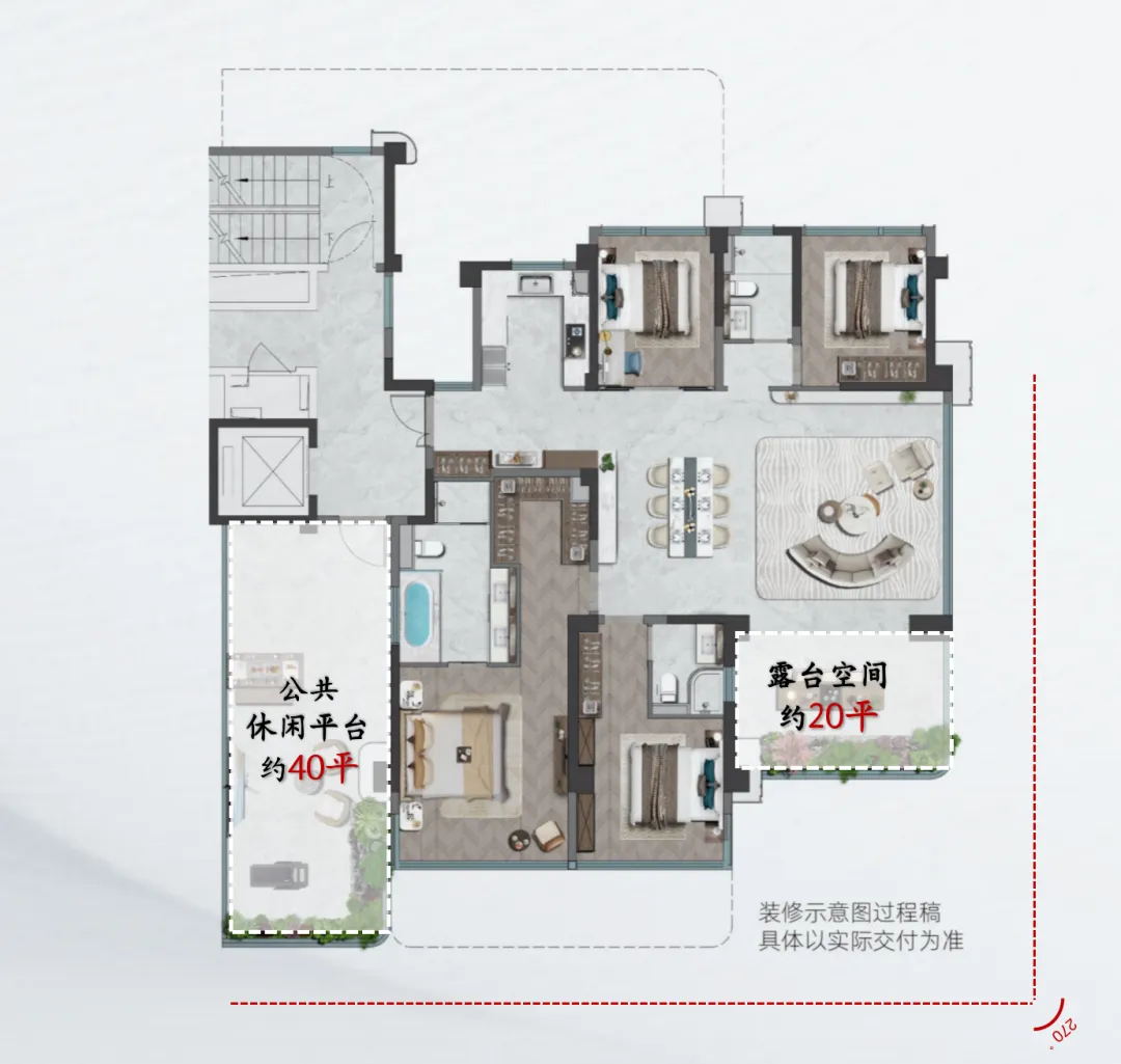福州保利天珺的四代宅户型,约20平露台结合约40平的公共休闲平台,整体做到了约60平的超大赠送面积