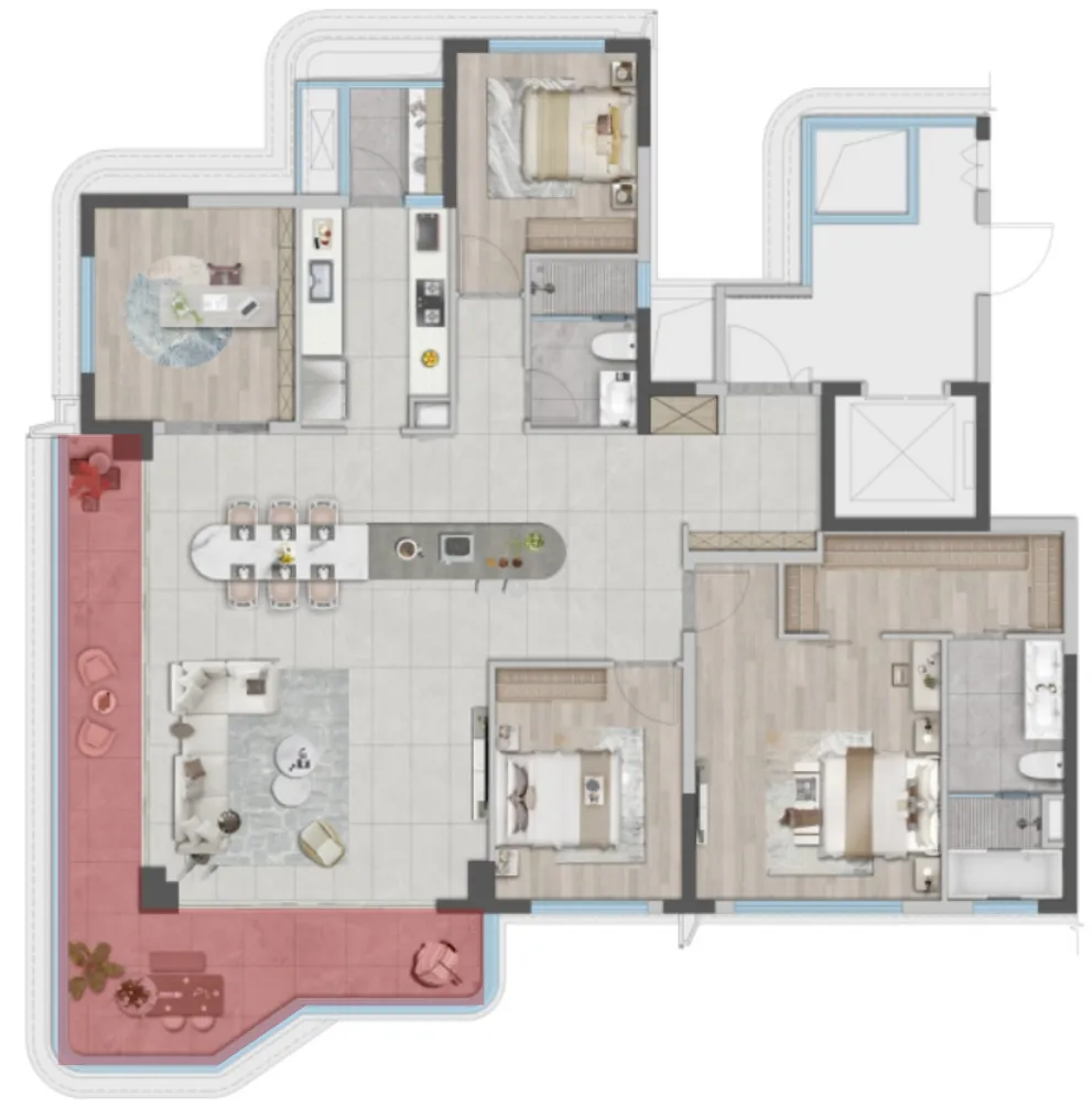 而这样大体量的露台为室内生活场景的塑造提供了极致多元的可能性