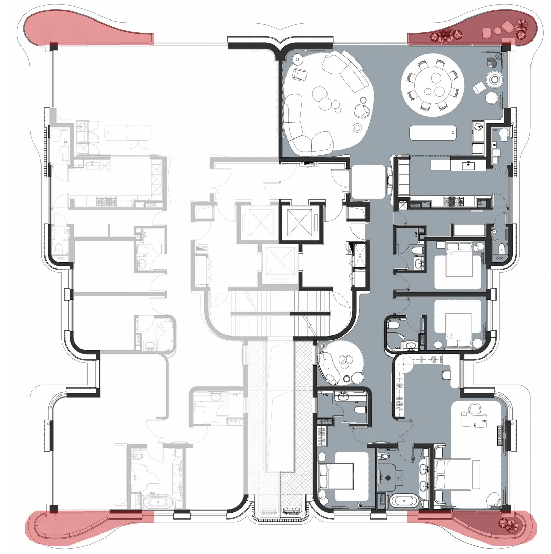 第二点很巧思的地方是,两户之间的阳台有充分的间距,也保证了豪宅邻居的私密性