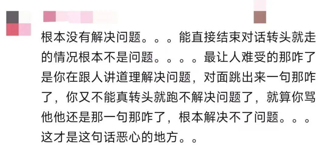 “那咋了”不包含任何信息,只是清晰地表示出一种态度。它拒绝沟通,拒绝更深的讨论,它以一种不容反对的态度将对话制止在了当下。