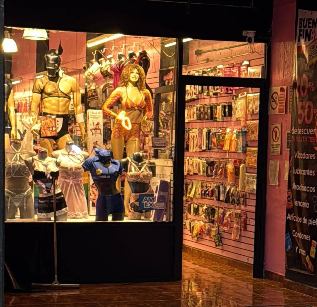 墨西哥人对生活的热爱,还有一点可以看出来,就是满大街的情趣用品店。不管是墨城唐人街,还是在独立纪念柱的市中心,到处都可以看见情趣用品店,Zona Rosa、Centro Histórico等区域聚集了很多娱乐、餐饮、夜店,这些地方的情趣用品店会更多。这些店门头很大,灯光明亮,商品琳琅满目,而不是灰暗灯光的小门脸。