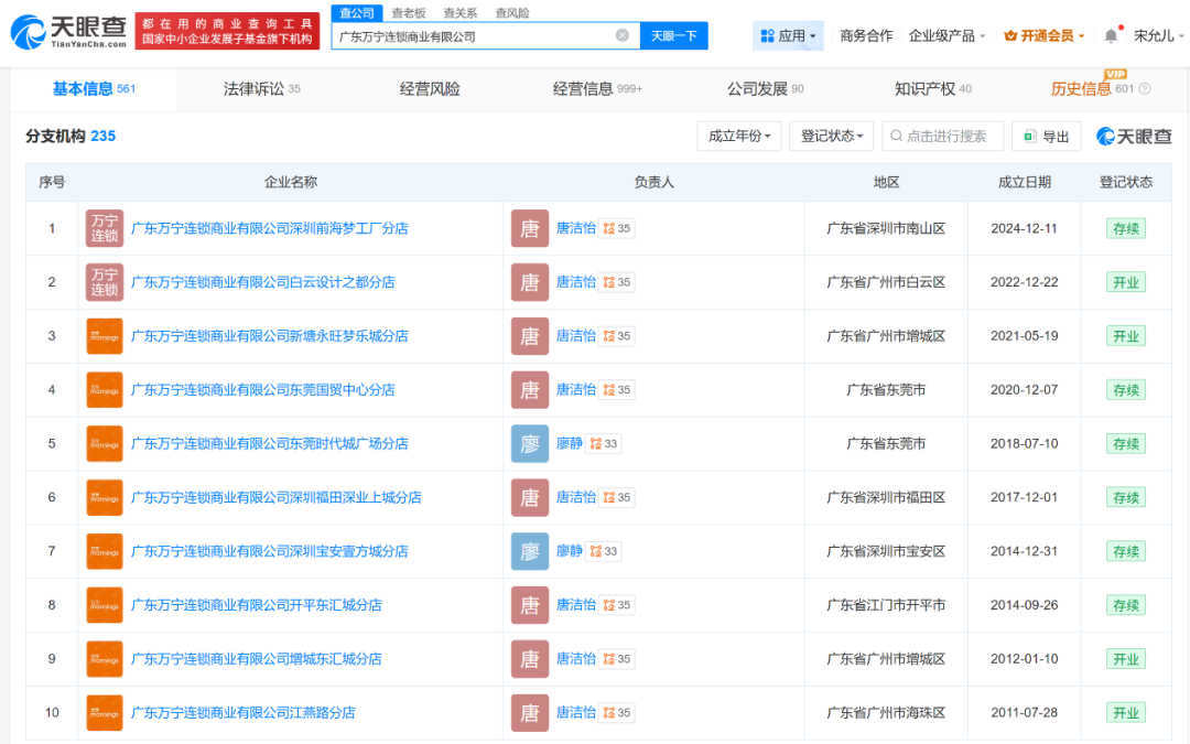 根据天眼查,截至发稿,万宁关联公司广东万宁连锁商业有限公司旗下的200多家分店大部分为注销状态,目前仍为开业或存续状态的分店仅有13家,主要位于广州、深圳、东莞、佛山和江门。
