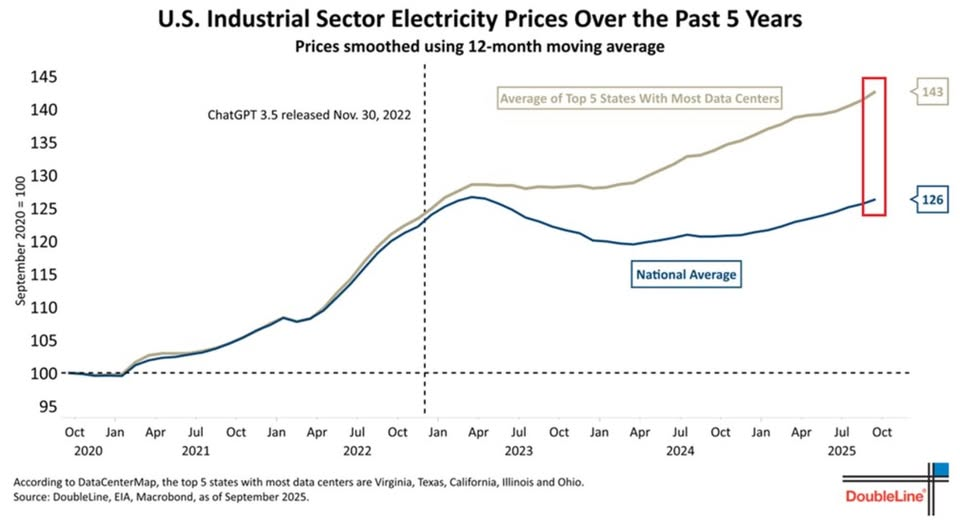 比如这两年美国大搞AI数据中心建设,实际带来多少收益尚未可知,但先把周边美国人的电价给搞上来了。凡是建了数据中心的地方,不管是工业电价还是家庭电价都在飙升。