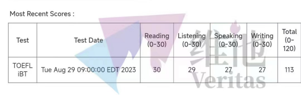 他的托福从104分提升到113分(阅读30、听力29、口语27),成功拿到了弗吉尼亚大学(UVA)的录取。但这9分的提升,靠的不是「临时抱佛脚」。