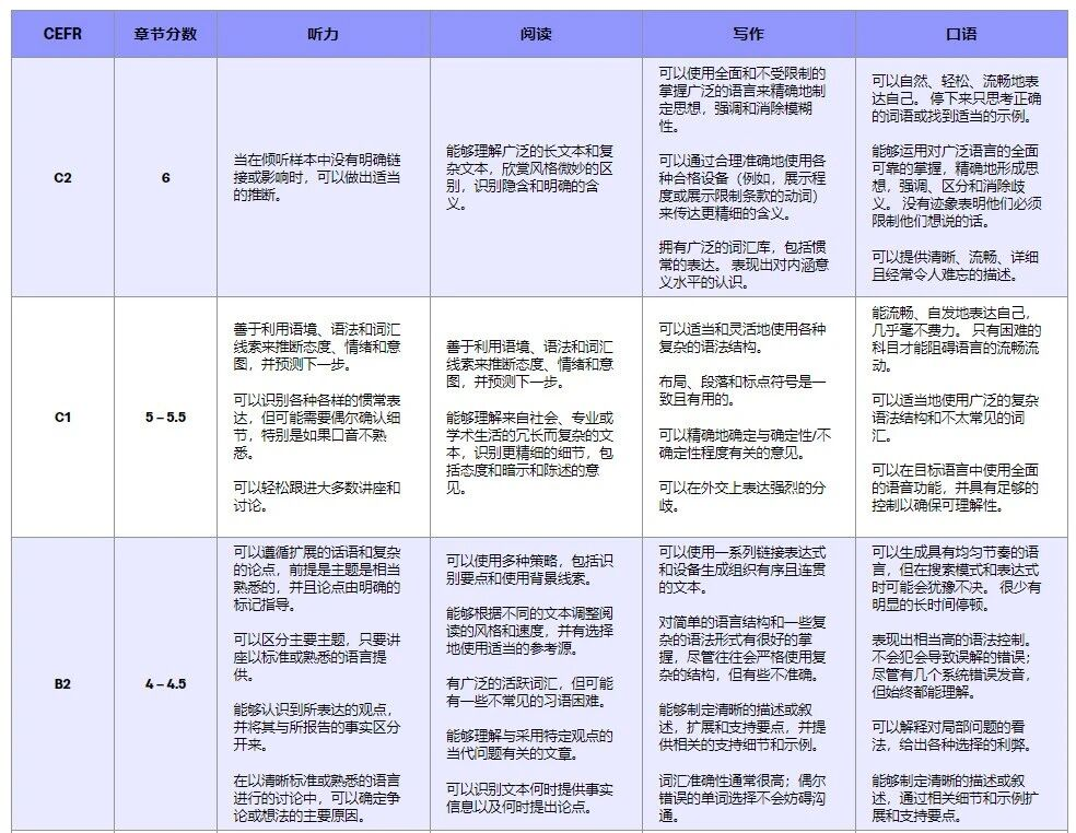 它把学生的语言能力分成6个清晰的档位,每个档位对应不同的沟通水平——从「基础」到「高级」,从「能听懂课」到「能深度参与学术讨论」。
