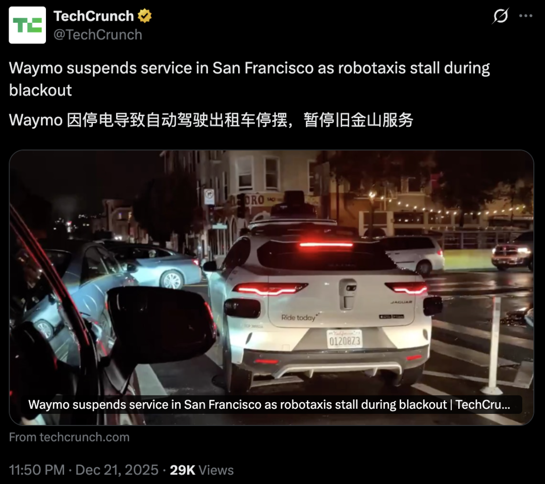 为什么一次突然的停电,会让被视为“比人更安全”的Waymo自动驾驶系统停摆?