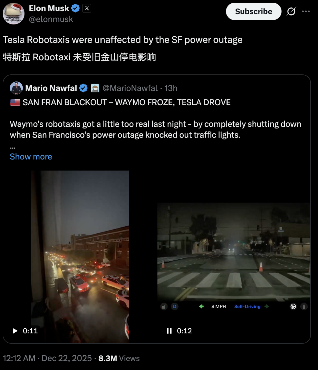 马斯克转发了X平台关于旧金山停电带来的混乱场面,还轻描淡写地补了一刀:特斯拉的Robotaxi,在这次停电中“完全未受影响”。