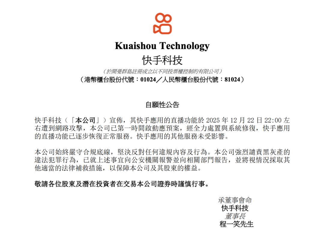 午间,快手在港股发布自愿性公告,称快手应用直播功能于昨晚 22 时左右遭到网络攻击,公司已第一时间启动应急预案,经全力处置与系统修复,快手应用的直播功能已陆续恢复正常服务,快手应用的其他服务未受影响。