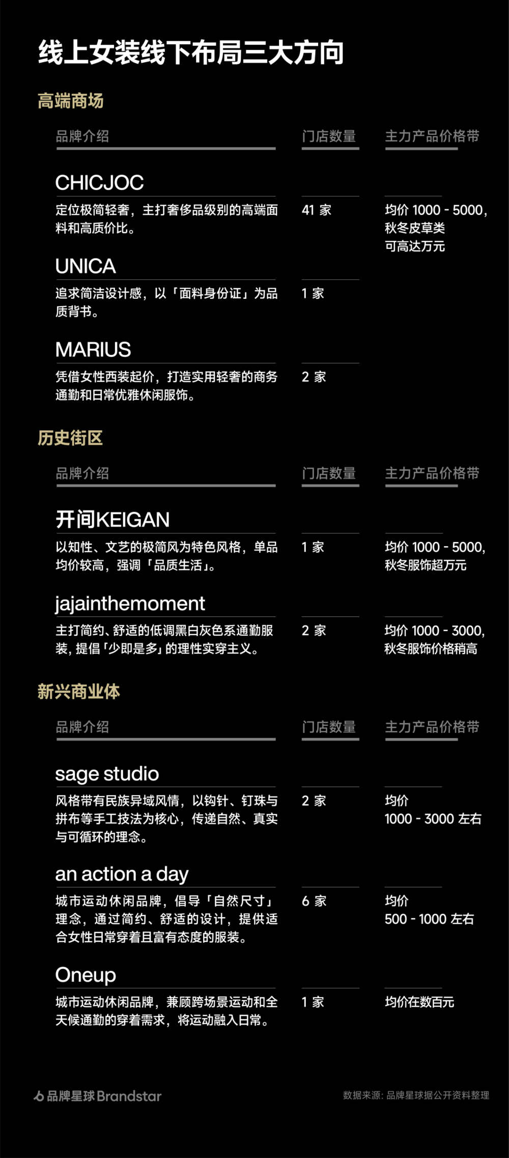 女装成长路径的变化:传统女装品牌因模式老化、未能跟上线上发展趋势而逐渐掉队。这批成长于线上的新锐女装,如今提供了「线上积累-线下破局-全渠道/全球化增长」成长路径的新范本。BRANDSTAR
