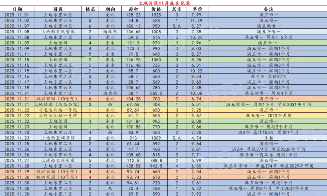 二手房这边,我拿到上地板块11月二手房成交的一些数据显示,确实有一些房源成交价格在7万以下,但是深入了解之后发现,这些低价房源要么楼层太高没有电梯,要么就是户型太大。