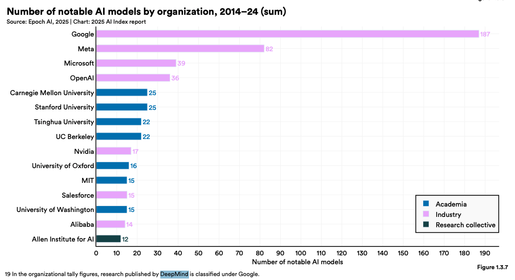 模型开发的主导权已经转移至企业。根据斯坦福大学HAI发布的《2025 AI Index Report》,OpenAI、Google DeepMind、Anthropic等科技巨头垄断了最顶尖的基础模型研发。2024年,全球近90%的标志性AI模型由企业开发,而这一比例在2023年仅为60%,在2014年以前则主要由高校主导。