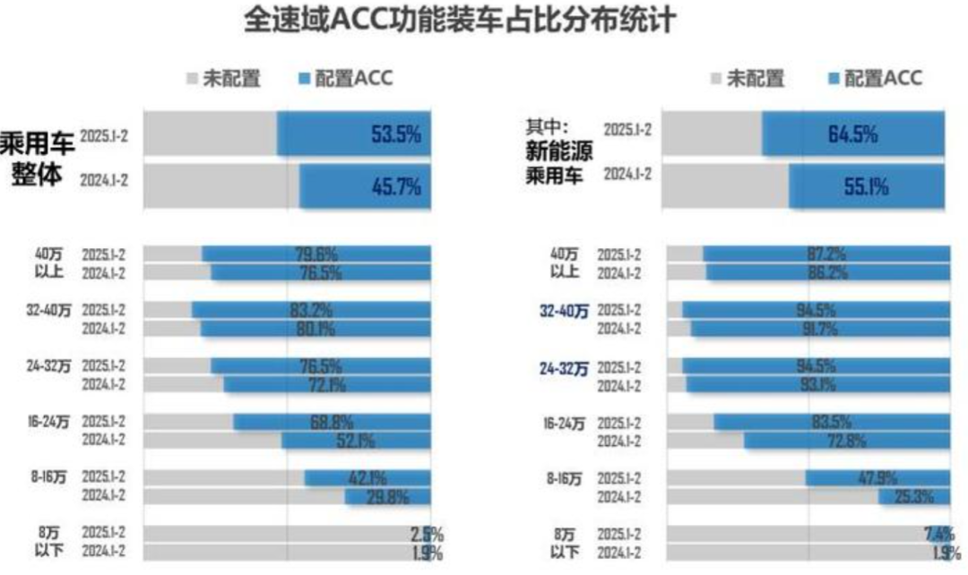 也是因此,根据乘联会的数据,如今市面上的新车ACC功能的搭载率已经达到了57.5%,如果把范围缩小到新能源车,搭载率更是去到了71.6%。
