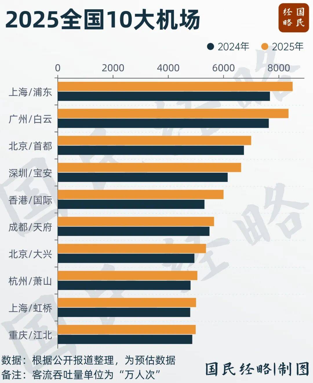 这也是我国目前仅有的两个8000万级机场,双双跻身全球前十。