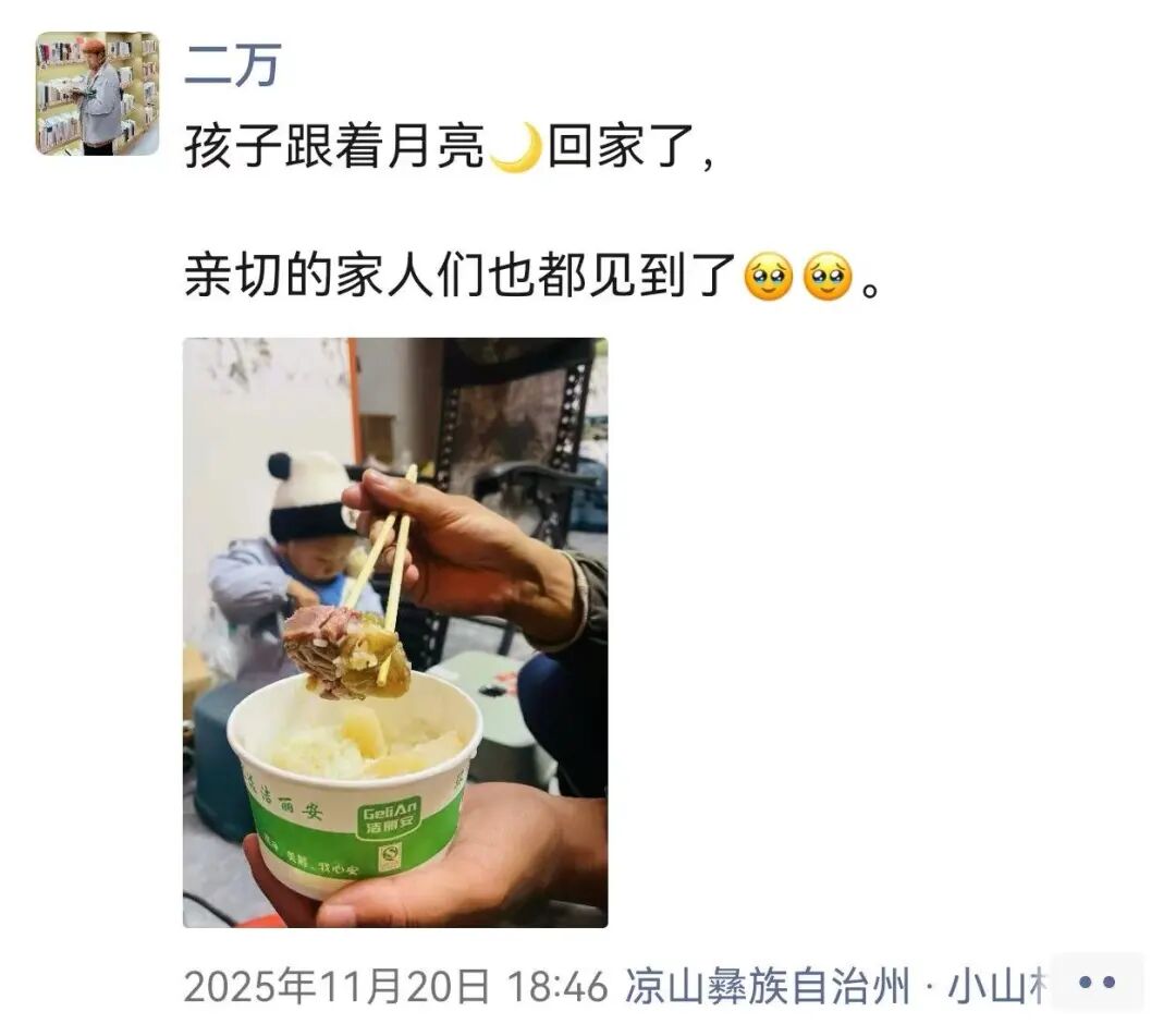 对于在成都挤地铁、做自媒体的彝族青年二万来说,过年的序幕是从跨进凉山家门那一刻开启的。他给我发来一条信息:“孩子跟着月亮回家了。”随之传来的照片,是火塘边热气腾腾的“坨坨肉”。