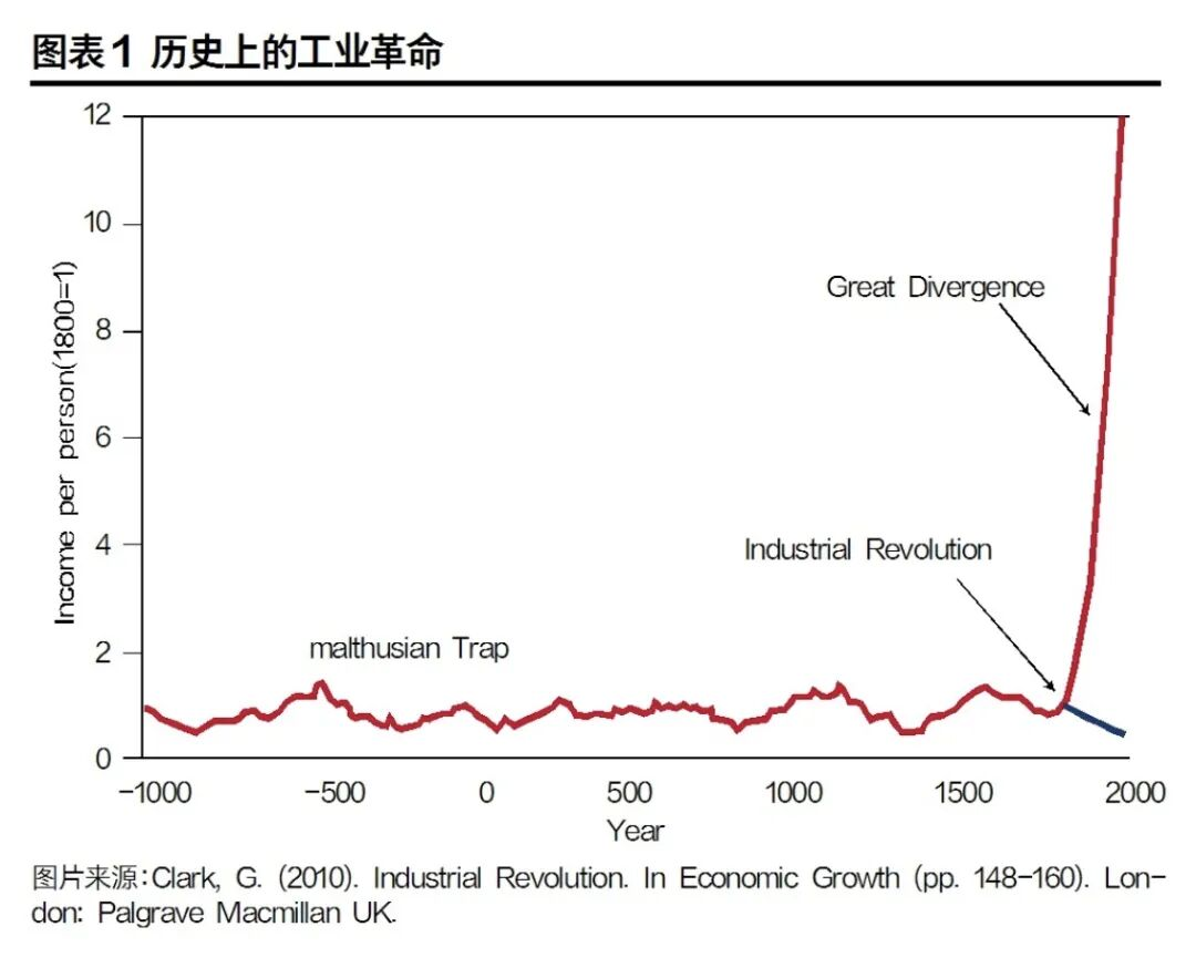 抛开中西之分,从全球来看,在过去几千年里,世界经济曾长期处于“马尔萨斯陷阱”所描述的低人均收入水平状态,这一情况直到第一次工业革命(1800年前后)才迎来转折。少数国家的人均收入开始飙升,并逐步带动了全球经济的腾飞,打破了持续到工业革命以前的“超稳定”状态。第一次工业革命将人类发展带入了一个崭新时代:经济发展迅猛,科技进步日新月异,社会变革的步伐不断加速,历史性的转折点和关键拐点不断涌现。