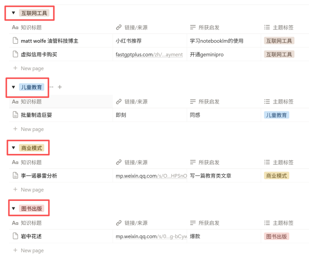 在我使用Notion以后,所有从外部进来的知识会进入我的“知识资产管理”库,它们的存在会关联到另外几个库,要经过我的处理后变成我的知识体系。