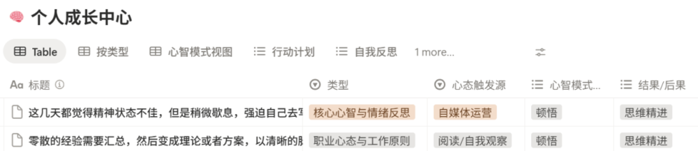 再比如,我在“个人成长中心”里记录了很多我临时冒出的一些正面或者负面的想法,以追踪我的情绪波动。我为我的这些想法设定不同的心智类型,包括未来灾难化、着急/冲动,顿悟、情绪失控,认知优势等。当我按心智类型进行筛选,就能看到每种类型下面我具体记录了哪些事情。哪些类型里的条目最多。