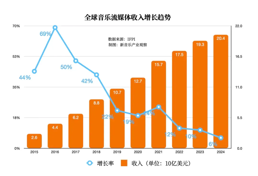 AIGC快速发展的同时,音乐数字经济的机能也在2025年显示出衰退的迹象,简而言之就是音乐流媒体收入涨不动了。