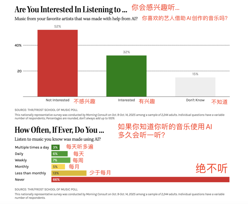 另外,《好莱坞报道》早前发布的一个调查显示,受访者对于AI音乐爱憎极端分明,要么很喜欢,要么很反感。而且,至少在2025年,反感AI的人是大多数。