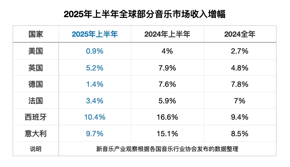 2025年上半年,美国录制音乐市场的收入增长不到1%,德国的录制音乐市场只涨了1.4%,英国、法国、西班牙和意大利的增长也不如去年同期,而韩国音乐消费去年至今一直萎靡不振。
