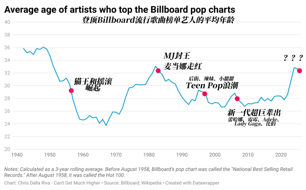 在《00后为什么还没能接管音乐圈?》一文中,新音乐产业观察曾经讨论过音乐圈“大龄化”的问题,据音乐人兼学者克里斯·达拉·里瓦(Chris Dalla Riva)对过去八十年来的Billboard Hot100榜单所做的研究,登顶艺人的平均年龄呈现周期波动,并总会在某个周期呈现“大龄化”的趋势。