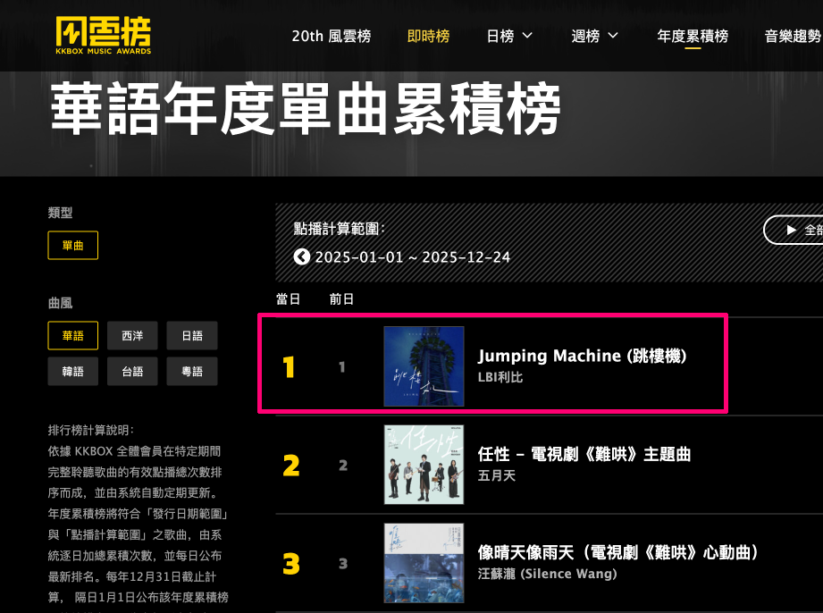 《跳楼机》不但在内娱是全平台冠军,还是中国台湾的年度第1;《大展鸿图》不但帮助揽佬在2025年创下华语歌手的Spotify月听众量新纪录,还是Spotify上播放量最快破亿的中文歌。